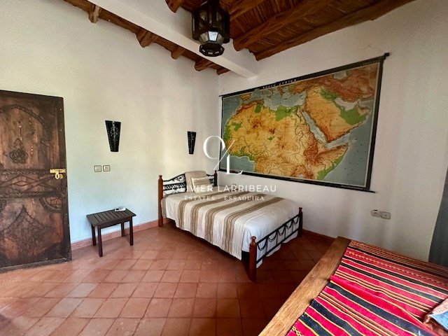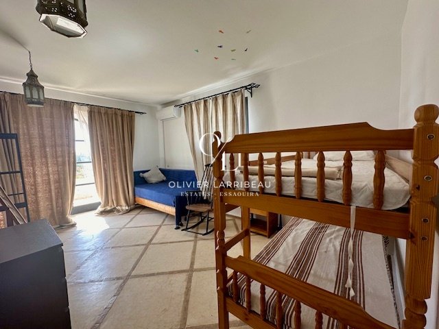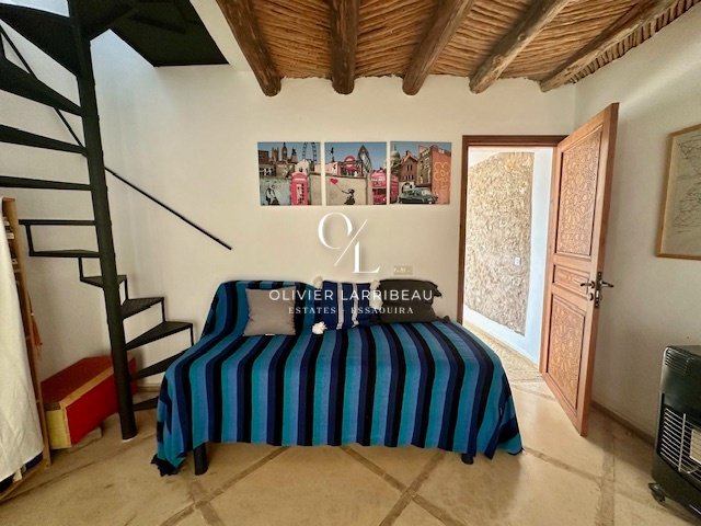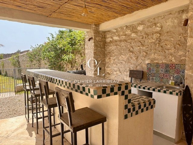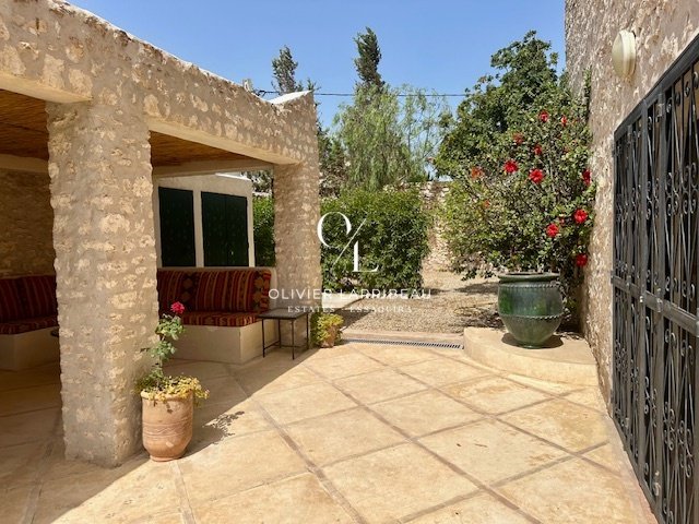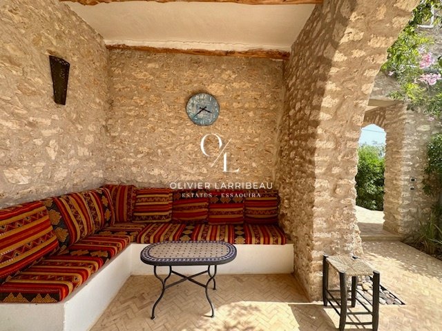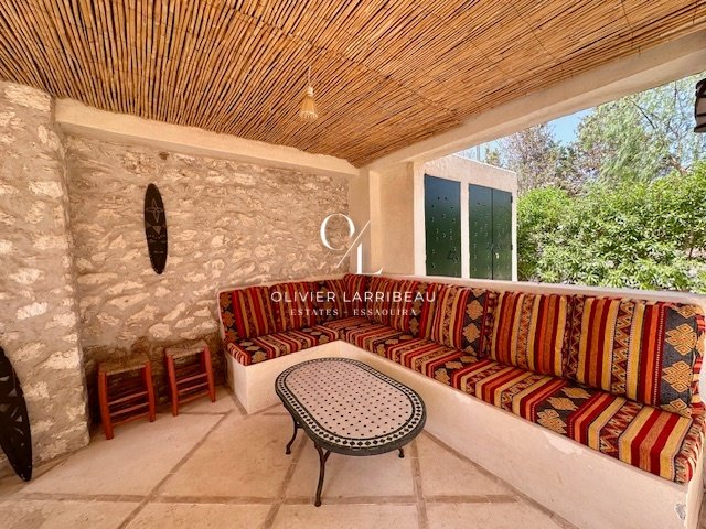 Terrasse couverte pour les repas en plein air avec banquettes marocaines.