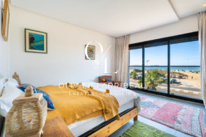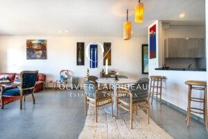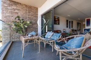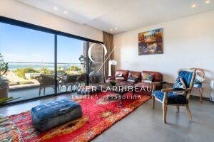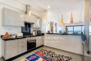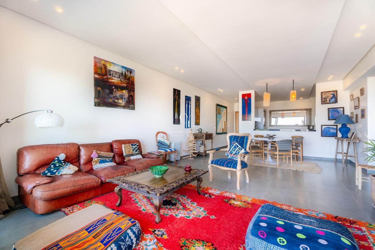 Très bel appartement de plus de 100 mètres carrés face à l’océan. Situé au premier étage d’une résidence standing avec ascenseur, cet appartement bénéficie d’une belle entrée desservant une cuisine entièrement équipée ouverte sur un espace salle à manger, salon et terrasse avec vue mer.