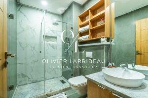 Cet appartement dispose de deux belles chambres doubles avec placard, ainsi que de deux salles de bain (douche, vasque, toilette). L’appartement bénéficie également d’une troisième chambre d’appoint (un lit simple avec placard de rangement sur mesure).