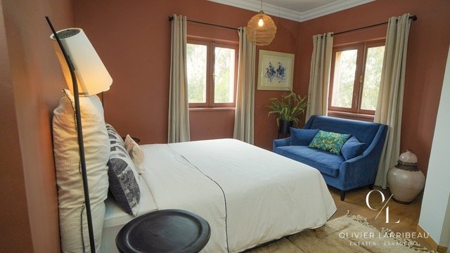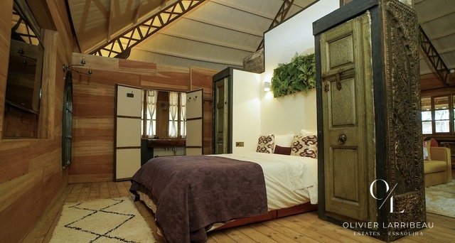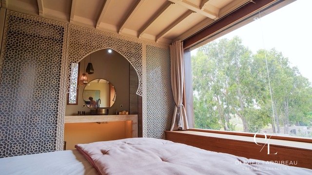 – Suite parentale avec espace suspendu offrant vue panoramique sur le domaine (37 m2) avec  Air-conditionné, sols et meubles en bois d’Iroko, salle d’eau en Travertin