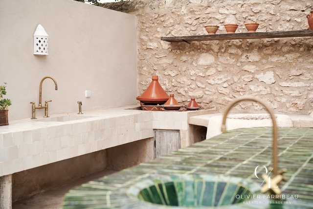 – Entrée + grand salon d’été (67 m²) avec Cheminée ouverte et bar en Tadlac.  Sol en Bejmat traditionnels.