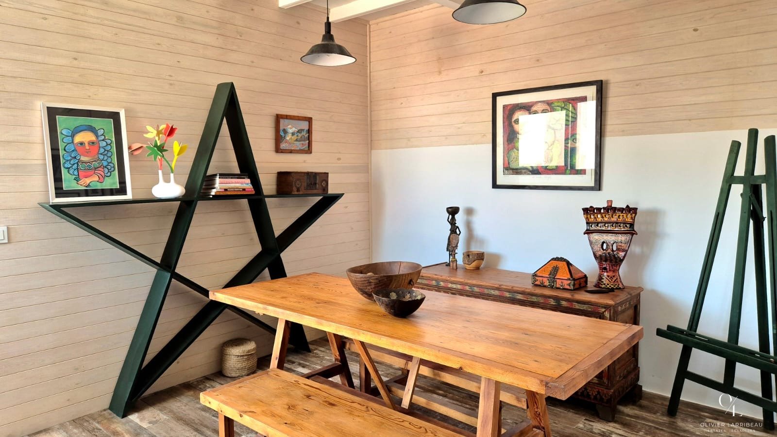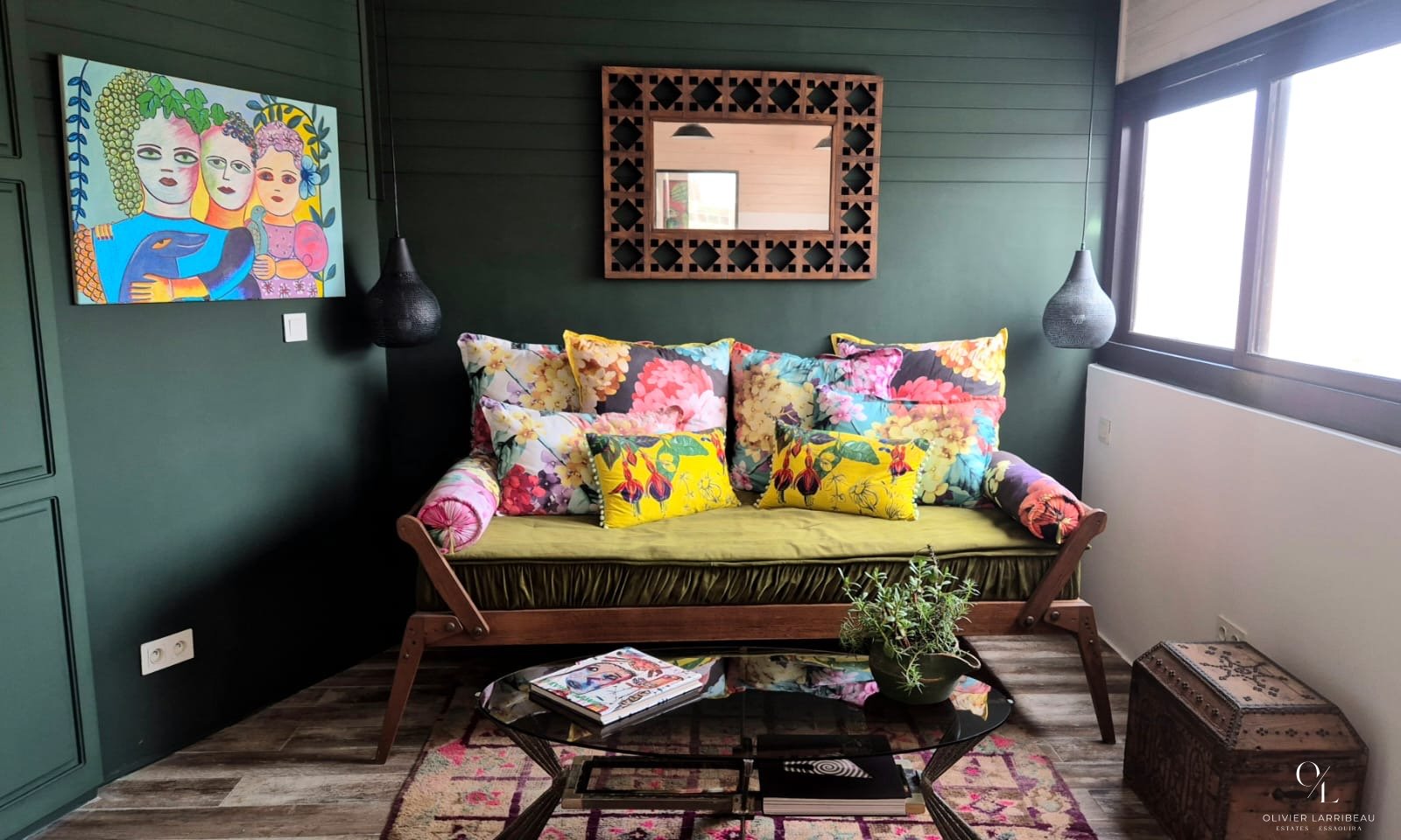 • Troisième étage : un salon élégant avec canapé coloré, un atelier et une buanderie équipée.
