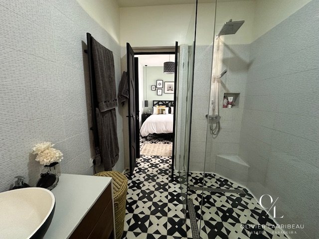 • Premier étage : un grand dressing, un petit salon contemporain et deux chambres doubles avec salles de bains privatives (dont une avec baignoire).
