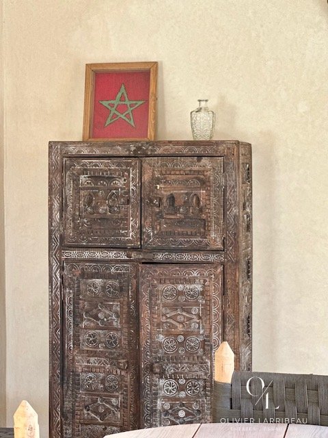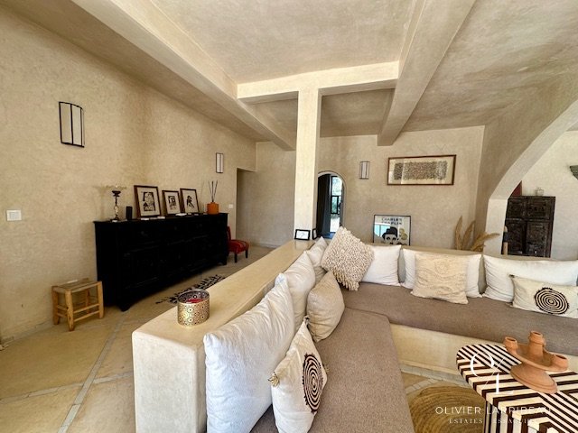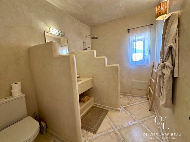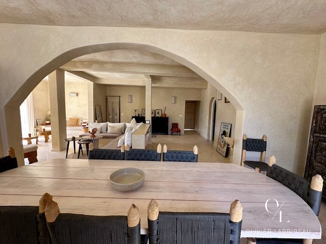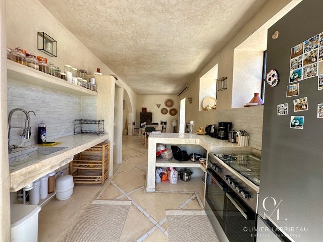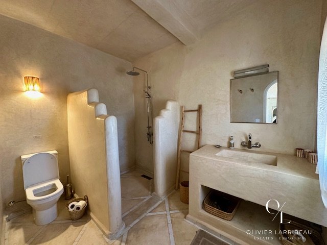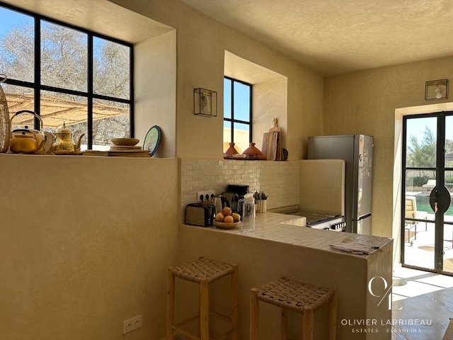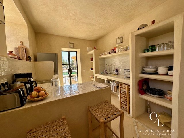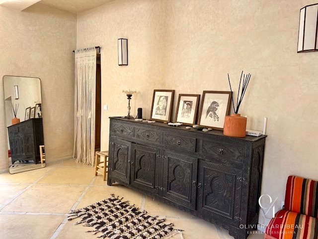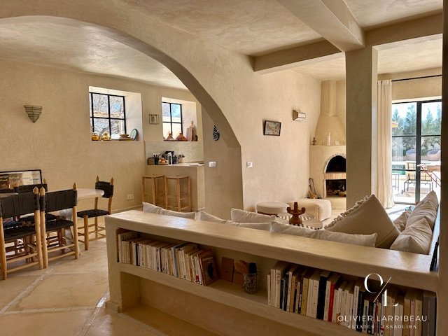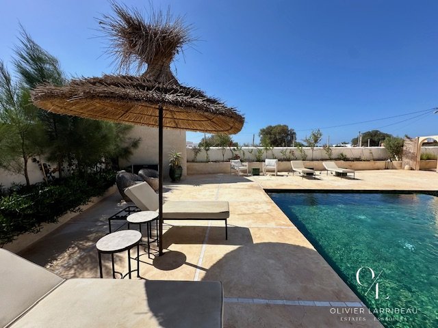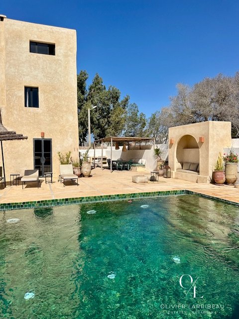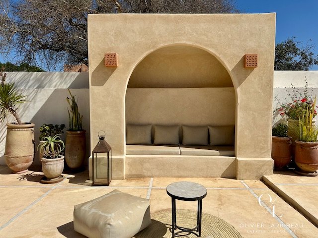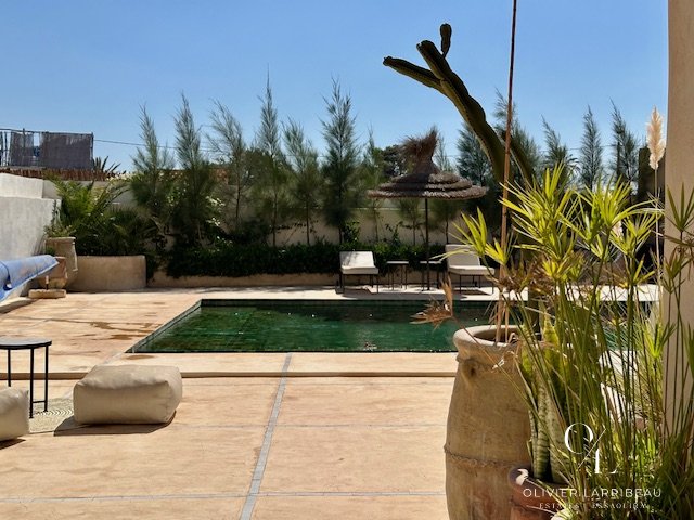 Les extérieurs invitent à la détente : coin barbecue et brasero, espace repas ombragé et superbe piscine 5 m par 8 m en zellige de Fès chauffée par pompe à chaleur. Un local technique et des espaces de rangement optimisent la fonctionnalité.