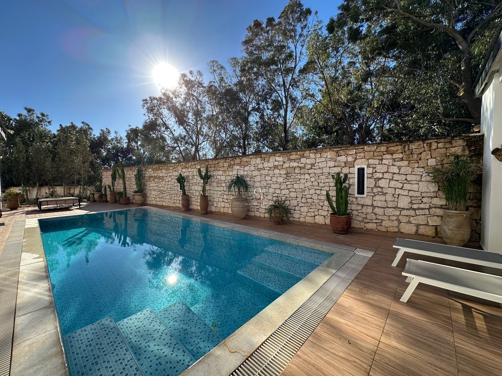 Rez-de-chaussée Le rez-de-chaussée se compose d’une entrée principale donnant accès à un vaste espace de vie avec très belles hauteurs sous plafond comprenant un salon TV, une salle à manger et une cuisine ouverte entièrement équipée. Cet espace bénéficie de larges baies vitrées ouvrant directement sur la piscine, le pool housse et la cuisine extérieure avec plancha et coin repas. Ce niveau comprend également une buanderie, des toilettes invités ainsi qu’une suite parentale d’environ 30 m² avec salle de bain (douche, vasque et toilettes).