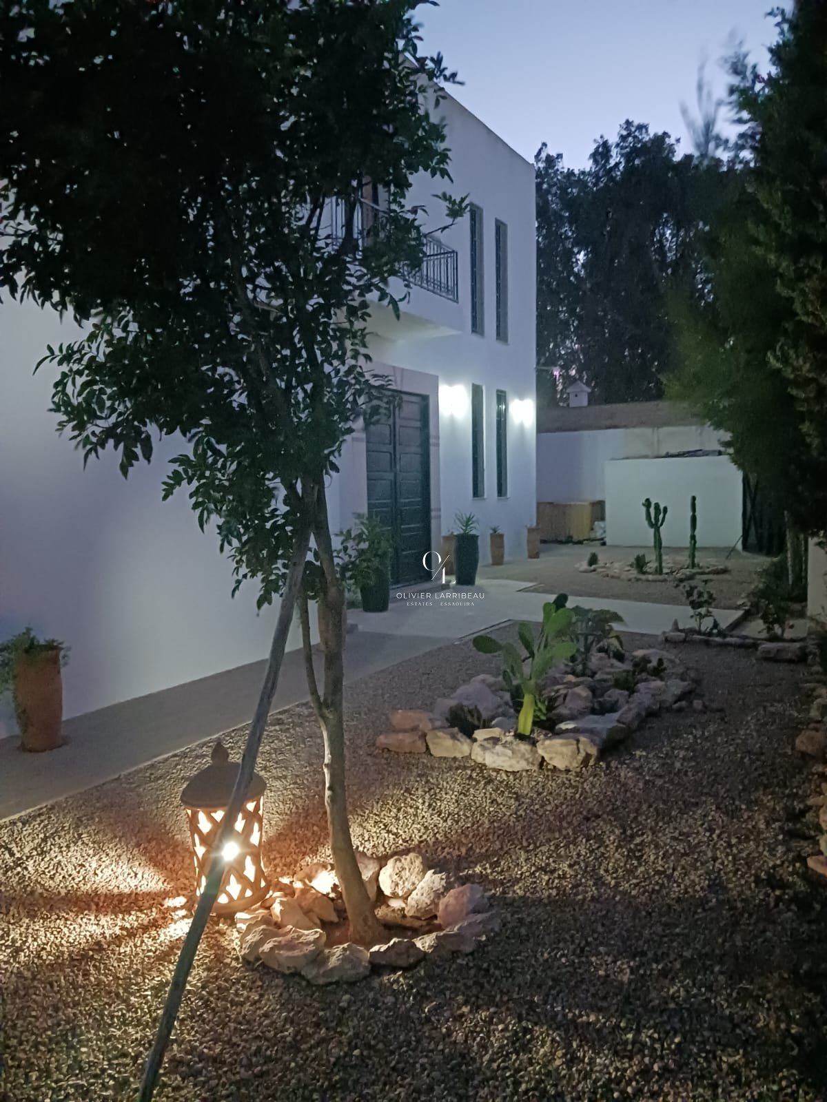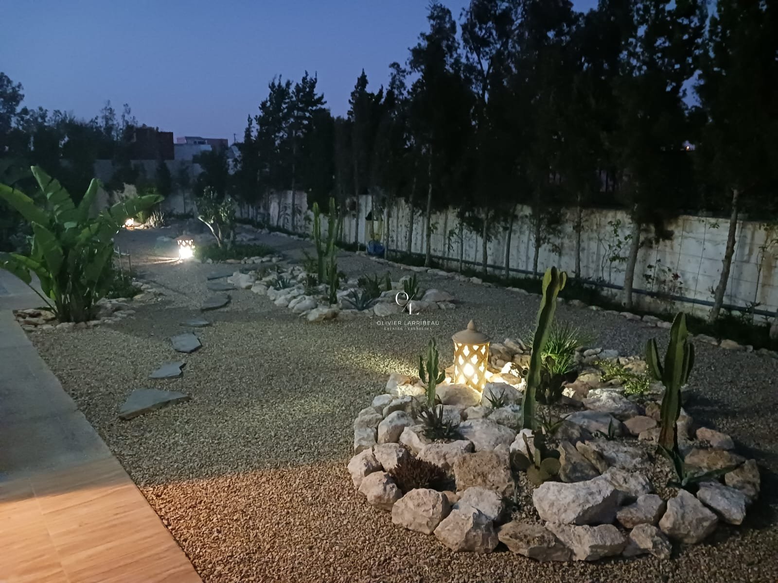 Jardin paysager de style méditerranéen planté avec arrosage automatique et éclairage extérieur par détecteurs de présence.