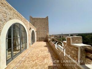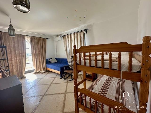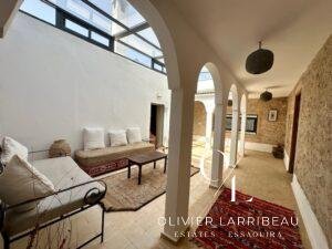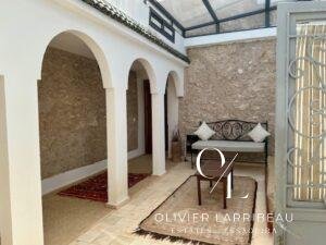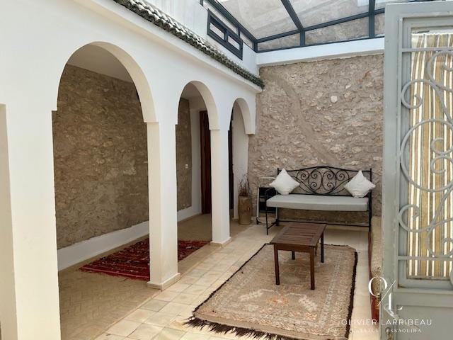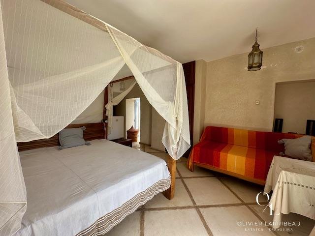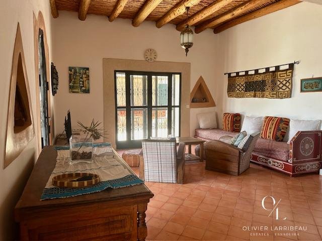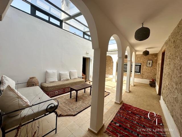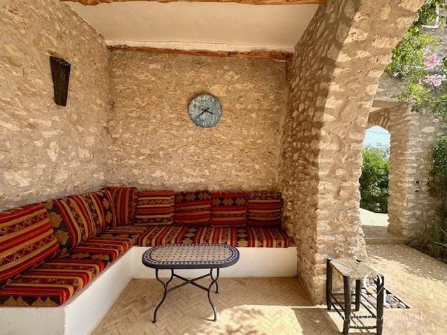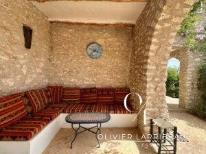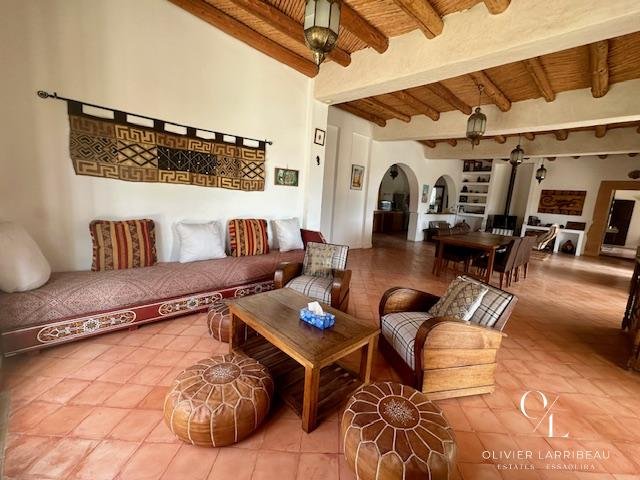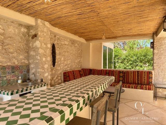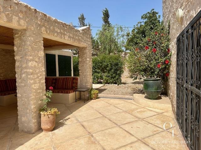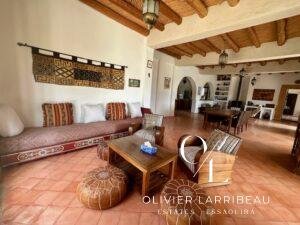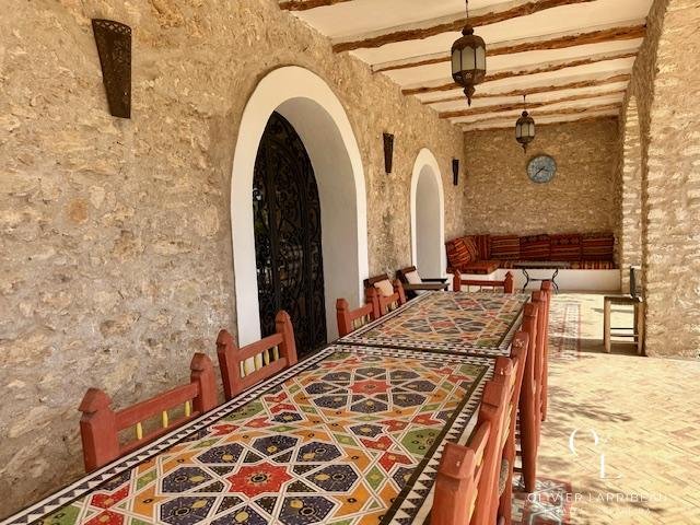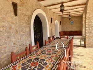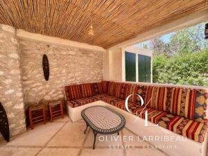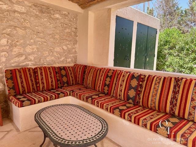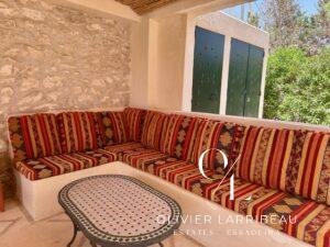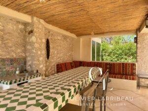 Terrasse couverte pour les repas en plein air avec banquettes marocaines.