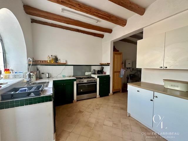 Cuisine ouverte sur le séjour, arrière-cuisine et buanderie avec accès extérieur.