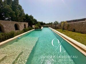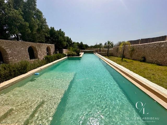 Grande piscine à débordement (18×2,5m et 18x4m) entourée d’un espace bronzage. Terrain plané, arboré et gazonné.